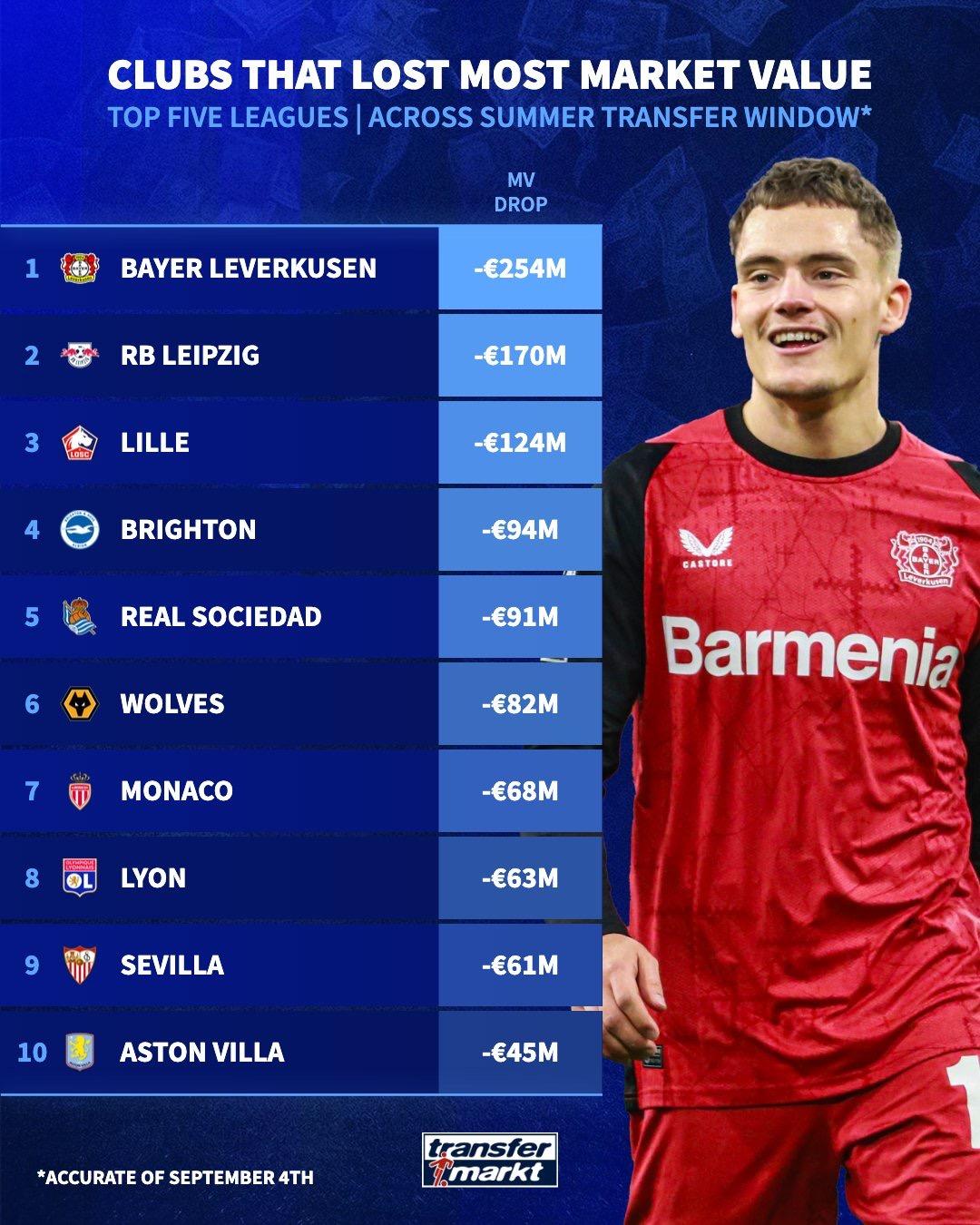 虎扑09月05日讯 据德转统计体育集锦,适度9月4日在今夏转会窗时代,五大联赛多家俱乐部的总市值出现下落。其中,勒沃库森厌世最为严重,总市值下滑2.54亿欧元,位列榜首。