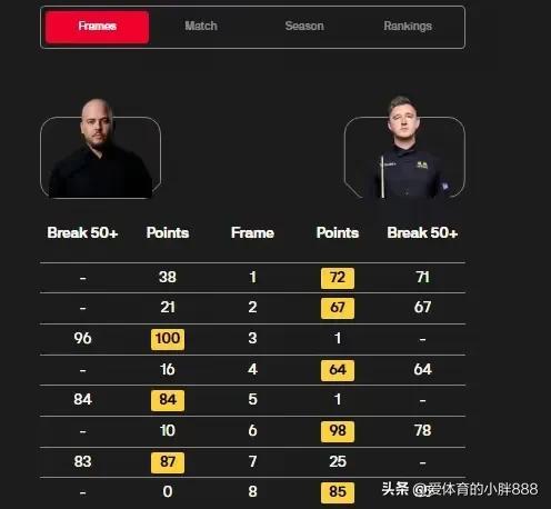 暂停回来后,布雷切尔火力全开,轰出单杆84分,扳回一局。第六局,囧哥回敬一杆78分,以98-10再赢一局,大比分拉开至4-2!第七局,布雷切尔轰出单杆83分,以87-25再赢一局,比分追至3-4!第八局,囧哥轰出单杆55分,以85-0拿下要害一局,从而以5-3拿到赛点!